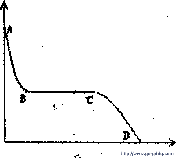 如果被测空气中氧浓度稳定,在传感器接上适当的之后,输出(或者)随时间变化的曲线如图1所示。图l曲线中。起初电压较高,这是由于碳质阳极表面预先吸附大量的活化氧聚集形成的。随电流输出,碳极表面氧急剧消耗,电压迅速下降,这是放电曲线的最初部分AB。当碳极表面吸着的氧一经消耗,被测空气中的氧重新吸附于碳极表面,被碳极表面活化。