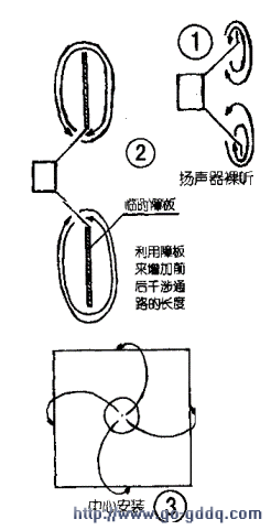 因为中心到所有四边的通路长度都相等,当波长等于一面通路长度的频率分量时,必将遭到严重的衰减(如图3)。而正确的方法(如图4),应该将扬声器挪到障板的一角,高度和聆听者耳朵高度相等的偏位安装,其就会得到很大改善。