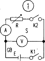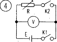 电路四:仅用一个电压表并联在电路中,如图4所示。实验时,改变电阻箱R的阻值,从电压表测出路端电压U。电流强度根据I=U/R计算得出,当Kl闭合,K2断开时,测得的路端电压,即电池的电动势。