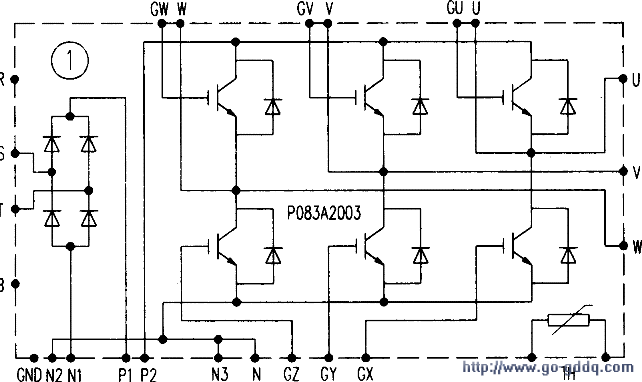 图l所示是P083A2003通用变频器功率模块的内部结构和引脚电路图。R、S、T是输入端,该模块是交流220V供电的,R脚为空脚。内部是单相桥式整流。