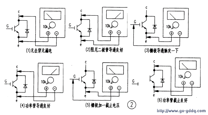 功率模块在路检测(脱离电网)时,用指针R×l挡分别正反测量整流桥的六个二极管和输出桥的六个IGBT管的集电极与发射极可判断其是否,表l和表2是正常测量结果,否则内部有击穿元件。用指针Bx1k挡分别测量六个IGBT管的栅极与发射极间的(驱动信号输入端)应一样,有不同时则是驱动电路或IGBT管损坏。以上测量只能测出IGBT管击穿性损坏。测不出开路性损坏。把功率模块从电路板上拆下后可对每个IGBT管进行进一步测量,方法如图2所示,表针在左边表示不导通。表针在右边表示导通。如不能使之导通和截止,则是该管损坏。