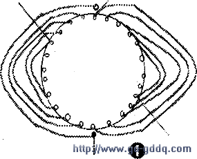 再嵌入大线圈的顺序。把第1个小线圈中带引接线的线圈边嵌入槽内,紧跟着按节距(Y 1跨5)嵌入另一边,紧跟着嵌入第2个线圈的上、下层边(Y 1跨7),依次嵌入第3个线圈(Y 1跨9),第4个线圈(Y 1跨11),第5个线圈(Y 1跨13)。