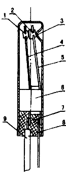 附图是JJD型精密缓动型热结构示意图。其中1、2-复合银触头;3-外壳;4-双金属片;5-弹簧片;6-基座;7-灌封胶;8-引出带;9-输出线。基本参数见表l、表2。