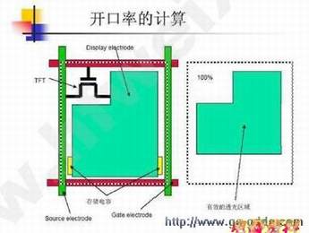 开口率是什么呢?简单的来说就是光线能透过的有效区域比例。下图的左边是一个液晶显示器从正上方或是正下方看过去的结构图。当光线经由背光板发射出来时,并不是所有的光线都能穿过面板,比如给LCurce驱动芯片及gate驱动芯片用的信号走线,以及TFT本身,还有储存用的储存等等。这些地方除了不完全透光外,也由于经过这些地方的光线并不受到电压的控制,而无法显示正确的灰阶,所以都需利用blackmatrix加以遮蔽,以免干扰到其它透光区域的正确亮度。所以有效的透光区域,就只剩下如下图右边所显示的区域而已。这一块有效的透光区域,与全部面积的比例就称之为开口率。