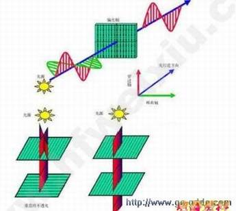 高中物理我们已经了解了光的波动性,光波的行进方向是与电场及磁场互相垂直的,同时光波本身的电场与磁场分量,彼此也是互相垂直的。也就是说行进方向与电场及磁场分量,彼此是两两互相平行的。而偏光板的作用就像是栅栏一般,会阻隔掉与栅栏垂直的分量,只准许与栅栏平行的分量通过。所以如果我们拿起一片偏光板对着光源看,会感觉像是戴了太阳眼镜一般,光线变得较暗。但是如果把两片偏光板迭在一起,那就不一样了。当您旋转两片的偏光板的相对角度,会发现随着相对角度的不同,光线的亮度会越来越暗。当两片偏光板的栅栏角度互相垂直时,光线就完全无法通过了。而就是利用这个特性来完成的,利用上下两片栅栏互相垂直的偏光板之间,充满液晶,再利用电场控制液晶转动,来改变光的行进方向,如此一来,不同的电场大小,就会形成不同灰阶亮度了。