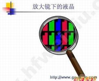 如果你拿着放大镜去观察液晶面板的话,你会发现如下图中所显示的样子。我们知道红色、蓝色以及绿色是所谓的三原色。也就是说利用这三种颜色,使可以混合出各种不同的颜色。很多平面显示器就是利用这个原理来显示出色彩。我们把RGB三种颜色,分成独立的三个点,各自拥有不同的灰阶变化,然后把邻近的三个RGB显示的点,当作一个显示的基本单位,也就是pixel。那这一个pixel,就可以拥有不同的色彩变化了。然后对于一个需要分辨率为1024*768的显示画面,我们只要让这个平面显示器的组成有1024*768个pixel,使可以正确的显示这一个画面。在图中,每一个RGB的点之间的黑色部分,就叫做Blackmatrix。它主要是用来遮住不打算透光的部分。比如像是一些ITO的走线,或是Cr/A1的走线,或者是TFT的部分。因此,我们在图中看到每一个RGB的亮点并不是矩形,在其左上角也有一块被blackmatrix遮住的部分,这一块黑色缺角的部份就是TFT的所在位置。