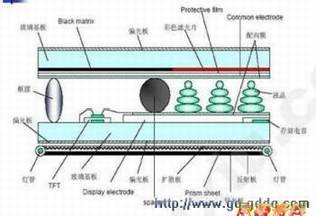 从液晶面板的工作原理我们可以知道液晶显示器需要控制来产生灰阶,而利用薄膜晶体管来产生电压,以控制液晶转向的显示器,就叫做TFTLCD。TFT液晶面板,由表及里分别由偏光板、玻璃基板、彩色滤光片、沉积在玻璃基板上的FET晶体管(薄膜晶体管)电极、液晶、同样沉积在玻璃质基板上的共通电极、底层偏光板、背光板(导光)以及背光源组成。