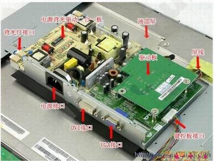 液晶显示器产品的迅速普及,对于我们这些做技术服务的维修人员来说,就意味着一个新的学习任务摆在了我们的面前。闲话少说,下面我们进入正题 ! 首先,我们看一张液晶显示器内部部分的结构图片;