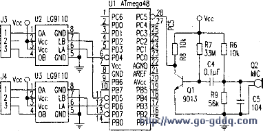 SL-02-8A声控直流减速电机(电原理图见附图)采用双列直插式LG91lO电机驱动集成芯片,用声音控制(PC5端)直流减速电机动作 ,PD4、PD5到电机驱动芯片U2(LG91lO)控制左电机,PD6、PD7到电机驱动芯片U3(L,G91lO)控制右电机。