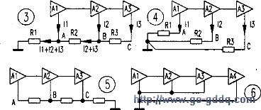 一点串联接地方式虽不如并联接地合理,但由于比较简单,便于印刷板电路的布线,因而在前、后级电路的信号差别不大(如都是小信号前置级放大)时,也可使用。不过应当注意把接地点设置在信号电平最低的最前级(如图3中的A点),因而该点最接近于地电位,而不应置于图5所示的最后级,因为这时A点电位偏离地电位最多,各级电流对输入级的影响也比前一种接法大。若各电路间的信号强度相差很多(如前置级与功率放大级在一起)就不宜采用串联接地了,因为这时级很大的地线电流将对前置级形成较大的干扰,故功放级地线应和前置级分开并单独引出地线接到公共接地点。见图6中的A4。