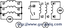 1 万用表置mA挡,按图2接线,假设一端接线为头(U1、V1、W1),另一端接线为尾(U2、V2、W2)。
