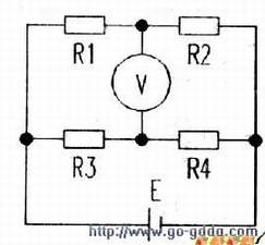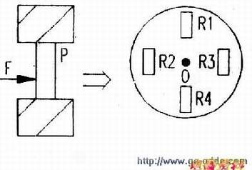 用于测量血压、大气压的压力结构。在薄膜P的内表面按一定方位贴有四片值相同的应变片。当薄膜受压发生形变(压力作用中心在0点)时,由定律可知,R1、R4因被纵向拉伸而电阻增大;R2、R3因被横向拉伸而电阻减小(沿纵向流动),将这四个电阻组成的电桥。P不受压时,R1×R4=R2×R3,电桥平衡,表的示数为零;P受压时,R1×R4≠R2×R3,电桥不再平衡,电压表示数将随压力大小而变化。这样,就可把随压力变化的电阻值以电压信号的方式检测出来,完成力与电的转换。市场上出现的一种电子血压计,体积只有拳头大小,重量轻,携带、使用非常方便。只要戴在手腕上,轻触按键即可测出舒张压、收缩压和心率,而且均以数字显示。该类产品的传感器就是压力传感器。
