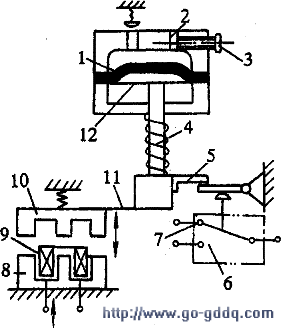 这种继电器有通电延时与断电延时两种类型。下面仅说明通电延时的工作原理,如图所示。当线圈通电时,衔铁“10”及1-橡皮膜2-进气孔3-调节延时固定在它上面的螺钉4-活塞杆5-撞块6-微动托板“11”被铁心开关7-触头8-铁心9-线圈
