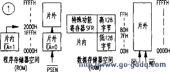 图1是AT89S52的存储器结构示意图。其程序存储器的寻址范围为0000H~FFFFH(64k字节)。