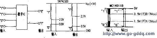以四为例,其多个输入端“1”或“0”的组合(或从“1”变到“0”、“0”变到“1”的组合),决定了其输出端“1”和“0”的组合,即输入和输出保持确定的逻辑关系,而没有模拟的“放大”作用,基本工作状态见图。由图可知,TTL(74LS00)和(MC14011)电路的输入、输出范围有相当差别。
