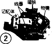 聚焦线圈分绕成两个线圈,置于骨架两侧;循迹线圈分绕成四个,每两个紧贴于聚焦线圈上,两磁铁置于两聚焦线圈中央;物镜粘贴在聚焦循迹线圈骨架前端中央孔上,并用塑料制成的2维平衡模制铰链型“记忆体”支撑,将物镜骨架悬置在两磁铁之中。此结构牢固、灵活,并提高了物镜突发性的加速度,能快速地完成聚焦、循迹、读取及跳选等动作,适用于多倍速读取。