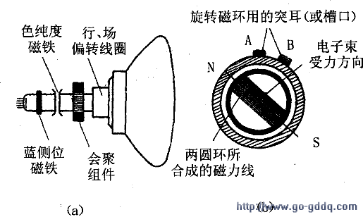 向任一方位一起偏转;二是要使偏转量能人为地控制。为了实现这两种调节,在管颈外附加一个色纯度校正磁铁组件,如右图(a)、(b)所示。该组件由两个磁环组成,它们各自在管颈截面上产生一个横向磁场。磁环上做有突耳或者槽口作标记,当两个磁环的标记重合时,横向磁场强度为零。当扩大两个标记之间的夹角时,横向磁场强度增强,使电子束的偏移也加大。当保持两个标记之间的夹角不变,让两个磁环绕管颈一起转动时,三电子束的偏转方位也随着转动。