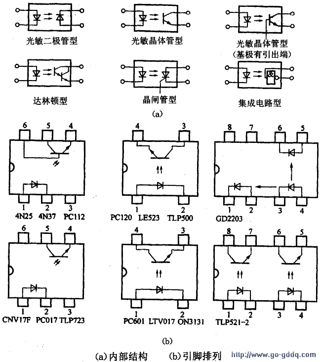 一般发光器件都是砷化镓红外,而受光器件一般有、硅光敏、达林顿型、光控晶闸管型及型等,其内部结构如图所示。