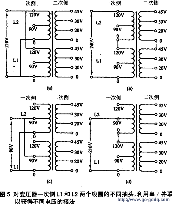 对于变压器的二次侧也可用并联方法接成20 V、30 V和45 V,在特殊的情况下,还可从20~30 V,20~45 V或30~45 V端子上获得10 V、15 V或25 V三种输出电压,如图6所示。