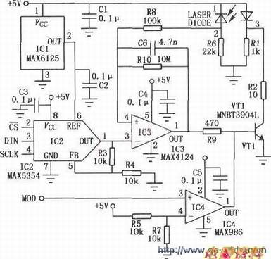 在激光管驱动中往往都会附带一个光电,它可产生一个正比于激光束强度(光功率)的,但这类光电管的响应大多相对较慢,一般无法跟踪激光管的峰值光功率。因此,本驱动电路是通过监测平均光功率来控制激光发生器的。可视激光数控调制驱动器电路如图所示,它包括一个3线串行接口的10位数模转换器(),用于控制一个可见光激光管输出恒定的平均光功率;一条单独的数字输入线(MOD),通过一个具有漏极开路输出的比较器(4)和VTl,向VD1馈入脉冲,实现数字通信。