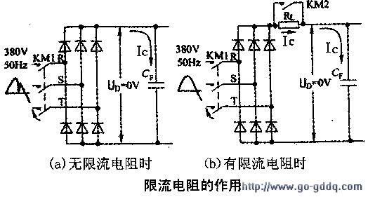 2.解决办法在三相整流桥和滤波电容器之间,接入限流Rl,将滤波电容器的充电电流限制在一个允许范围内。
