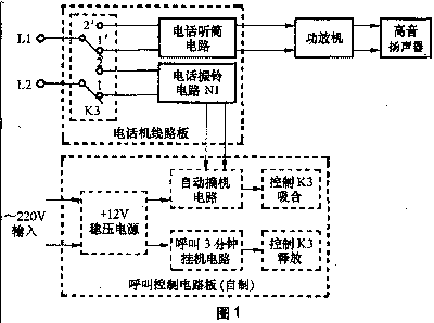 本电路是由普通电话机线路板、低频电路、拨号自动摘机电路、定时自动关机电路和高音扬声器几部分组成,电路方框图如图1所示。将以上电路(除音箱)安装固定在一个小盒内。本电路对元器件的要求不是很严格,使用方便可靠、效果不错。