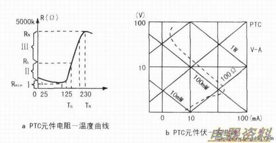 是以钛酸钡为主要原材料的一种N型半导体。它的值与温度曲线如下图所示,在这个曲线上,有几个特征温度值和这些温度所对应的特征值。1.室温电阻(R25):又称元件的标称电阻值。即元件在25℃时的零功率的电阻值。2.最低电阻:即指电阻一温度曲线上最小值点的元件电阻值,用Rmin表示。对应此电阻值的温度用Tmin表示。3.开关温度(Tb):当元件的零功率电阻值为2倍的Rmin时所对应的温度,此时电阻值记为Rb。4.最大电阻(Rn):元件在温度曲线上的最大电阻值。对应RN的温度为TN。下图a中I为低阻区,即开状态区;Ⅱ为高阻区,即关状态区,Ⅲ为失效区。由图可见,当温度超过开关温度Tb时。电阻值急剧增加。但当温度超过最大电阻后。随着温度的增加,其电阻值开始下降。由于元件区的减少继而变为负值。所以反应在伏一安曲线上表现为回升现象。见下图b。由于PTc具备以上特性,故在变频系列空调中被广泛采用。用以对整机的和工作起限压、补偿和缓冲作用。