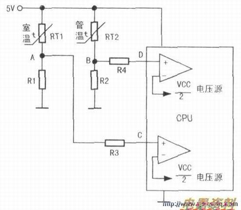 在确定温度传感器阻值之前,先谈谈cPu控温接口和控温的原理,见上图。温度传感器采用的是负热敏。即在温度升高时阻值减小;温度降低时阻值增大。CPU内部与温度传感器接口是一个运放比较器,比较器的负端取样为CPU电压的1/2,也就是2.5V。而外围电路RT1和RT2就是运放比较器正端的。R1和R2是下偏置。空调电路设计人员以常温25℃为基准。也就是25℃时,RT1=R1、RT2=R2,A、B点电压为2.5v。有些电路设有R3、R4,主要起缓冲作用。当环境温度升高时RT1阻值减小,A点电压上升。比较器输出一差压。经CPU内部一系列处理,去控制内外机运行状态。