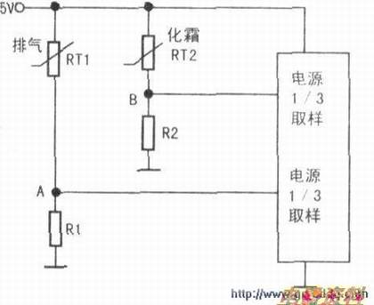 从中图可以看出,A、B两点电压在常温25W:时,RTl阻值为250kΩ(排气热敏电阻要大),下偏置电阻R1为82kΩ,同理,化霜热敏电阻RT2为10kΩ,下偏置电阻R2为3.3kΩ。