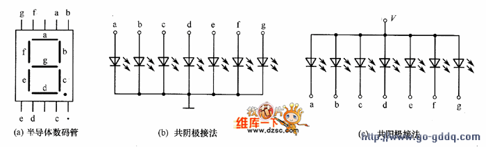 半导体七段显示器分为共阴极接法和共阳极接法两种,分别如图2(b),(c)所示。对于共阴极接法 ,若需某字段亮,则需使该字段为高电平;同理,对于共阳极接法,若需某字段亮,则需使该字段为低电平。