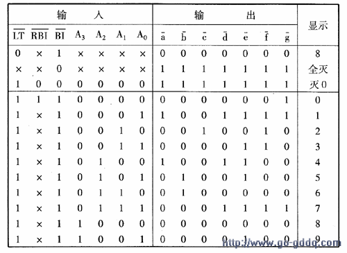灭零输入端RBI:当RBI=0时,且LT=1,BI=0时,若A3~A0的状态均为0,则所有光段均灭,在数字显 示中用以熄灭不必要的0。例如,显示0021,21前面的两个0是多余的,可以通过在对应位加灭零信号 (RBI=0)的方法去掉多余的零。