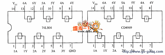 缓冲器的输出与输人信号位,它用于改变输人输出及提高电路的驱动能力, 74LS07 是集电极开 路输出同相输出驱动器,该器件的输出高达30V,灌达40mA,与之兼容的器件有 74HC07 , 74HCT07 等。74LS04,CD4069引脚排列图如图1所示。