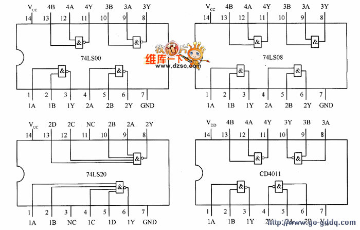 74LS08 是四2输人与门, 74LS00 和 CD401 1 是四2输入与非门, 74LS20 是双4输人与非门。