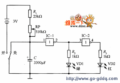 电路的工作原理:当开关在开的位置时,C上的电压由0V逐渐上升,上升的速度由R1,RP和C决定,第一 个反相器的输人端的电位由C上的电压决定,在C上的电压比较低时,对第一个非门IC-1的输人来说 为低电平,IC-1的输出为高电平,绿灯亮,第二个非门IC-2的输出为低电平,红灯开不亮。当C上的电压 逐渐上升到高电平时,IC-1的输出为低电平,绿灯灭,IC-2的输出为高电平,红灯亮。使用时,提醒时 间的长短是通过调整电位器RP的阻值设置的,RP越大,C上的电压上升的速度越慢,等待的时间越长,理 论上提醒时间为0.69(R1+RP)C,由于