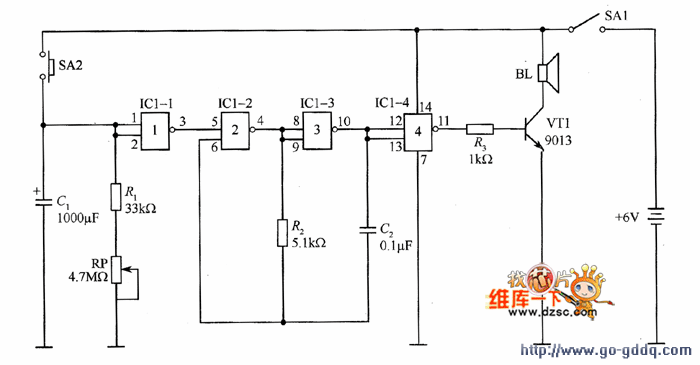 当按下电源开关SA1时,因IC1-1输入端接低电平,IC1-1的输出为高电平,IG1-2的控制端接高电平 ,使IC1-2,IC1-3,R2,C2组成音频振荡器工作, 发声。