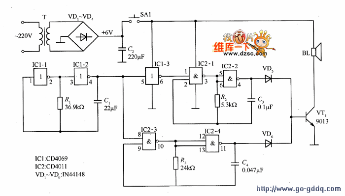 电路的工作原理: 220V 交流电经变压,经VD1~VD2桥式整流、C2,得到直流电压提供给控制 电路。电路中IC2-l,IC2-2,R2,C2组成音频振荡器,IC2-3,IC2-4,R3,C4组成另一个音频振荡器 ,这两个音频振荡器是否工作是由lCl-1,IC1-2和R1,C1组成的低频振荡器控制的。低频振荡器的输出 是矩形波,当输出为高电平时,与非门lC2-3的控制端为高电平,由IC2-3,IC2-4,R3,C4组成的音频振 荡器起振,音频信号经VD6加到VT1管基极,经放大后推动扬声器BL发声,此时,由于非门IC1-3的输人端 为高电平,输出为低电平,与非门IC2-1的控制端即为低电平,导致lC2-1,IC2-2,R2,C3组成的音频 振荡器停振。当低频振荡器的输出是低电平时,与非门IC2-3的控制端为低电平,由IC2-3,IC2-4,R3 ,C4组成的音频振荡器停振,而与非