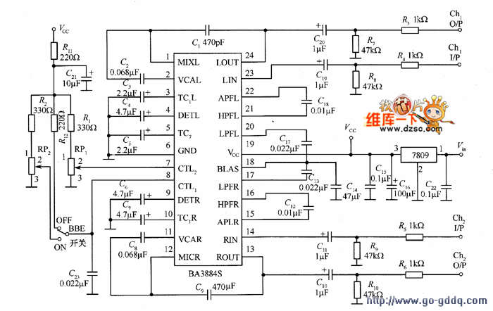 图1 由BA3884构成的高保真音效处理器电路用