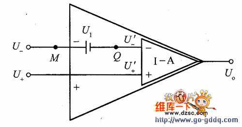 而理想运放的U_-U+=0,所以实际集成运放的“虚地点”要产生移动。图等效于在实际运放里面套有一个理想运放,