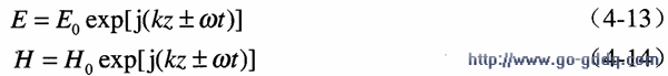 现在我们考虑一下传输的电磁波,跟 理论一样,我们可以用指数形式来表示传输波。电场和 磁场 可分别描述为