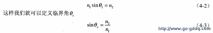 在图1中,因为θ2>θ1,媒质1的折射率n1明显高于媒质2的折射率n2。当G继续增加时,对应角θ2到达90°,这时菲涅耳定律简化为