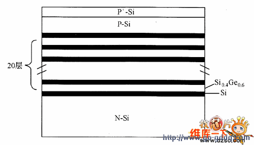 SiGe探测器不但能探测到红外波段,而且它比纯硅有更大的吸收系数,因此能制作出薄吸收层、高量子效率的高速探测器。己研制出的双异质结构的富锗SiGe合金探测器[75~徇在1.3 gm波长下响应度达到了0.89 A/W,为50 PS。H.Temkin等人[77]报道了锗组分为0.4的Si0.4Ge0.6/Si应变超晶格探测器,响应波长在1.3~1.5 gm范围内,如图1所示。通过MBE外延技术生长51.4Ge0.6和51层,由于晶格不匹配会存在较大应力,因此应严格控制应变层厚度(Si0.4Ge0.6层厚度为3~6 nm,51层厚度为21~29 nm),数为20~30左右。总厚度为650 nm的Si0.4Ge0.6/Si应变超晶格层作为PIN的本征吸收层。在本征吸收层上再生长掺B的P-Si,接触层为高掺杂的P+。整个器件长300 ,宽60gm,厚100gm,30~38 V,在-10 V偏压下漏电流随着锗含量的增大而增大(锗含量为0.4时漏电流较小只有0.4μA,组分含量大于0.6时漏电流达到了3pA)°器件内量子效率为40%,带宽达2 G。