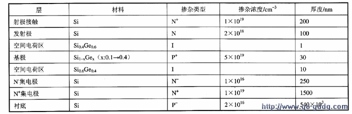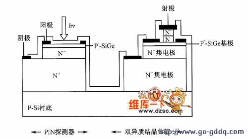 以上介绍的几种SiGe探测器都是分立的,虽然它们的制作工艺大都和微 电子 工艺兼容。SiGe/Si技术的发展使得异质结 成为现实,这种双异质结构晶体管(HBT)可以获得很好的注入比和很高的本征,如果能将SiGe探测器和HBT放大 集成在同一衬底上则可大大提高0E速度[81〕,如图3所示。PIN-HBT结构通过一步分子速外延而成。表1是各个层组分和掺杂特性,发射极和集电极是掺Sb的Si,基极是窄禁带宽度的SiGe,锗组分的含量从发射极这一侧的0.1渐变到集电极一侧的0.4。这样的渐变层能在基极形成“准”电场(Quasi- Eleic Fi)来加速电子在基区的输运过程。PIN则由N+-集电极和p+-SiGe构成,N-集电极作为PIN的本征吸收区。整个器件被台面结构隔离,PIN台面 面积为12 gm×13 gm。在外延生长过后,发射极接触被用电子束蒸发方法得到,接着用SF6/02干法刻蚀和KOH湿法刻蚀得到发射极台面结构。基区和集电区台面结构用干法刻蚀即可形成。最后用增强化学气相淀积法淀积一层SiO,。在4 V和9 V的反向偏压下,二极管的暗电流为0.1uA和1uA°对于850 nm波长入射光和9 V反向偏压下,测得带宽为450 MHz1.1 gm厚的SiO,作为抗反射层使得在5V偏压下响应度为0.3 AIW,响应量子效率为43%。由于本征吸收层还是51层,因此p+-SiGe阳极并没有将量子效率提高太多。为了提高响应度和波长响应有必要增加本征区锗含量,然而这会增加暗电流。可以通过生长多层SiGe/Si超晶格结构在增强本征区吸收的同时,将暗电流减小到较低水平。