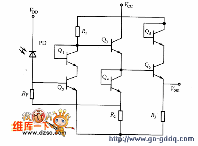 如图所示,PD为PIN探测器,Q2为共射输入级,Q3和Q6为射级跟随器,Qt、Q4和Q5为移位 。由于高速晶体管的通常较小,Qt和Q5分别减小了Q2和Q6的集电极-发射极差UCE以避免晶体管被。YDD和Ygg是为了分别使PIN和 放大器 工作在最佳状态下,yDD应该足够大以增加探测器耗尽区宽度,适当的Vgg使各个晶体管被偏置在合适的静态工作点上。 FF负反馈形成跨阻结构,其值大小决定了接收器的带宽、增益及特性。这些特性是相互影响、相互矛盾的,因此IRF的取值应该在这三个参数中折中。PF取640Ω得到了52.2 dBΩ的增益,1.6 G的-3 dB带宽。当VDD为9V,V为6V时,整个单片集成接收器的带宽为460 MHz。显然带宽受限于探测器带宽,因此可以适当增加反馈/iF值减小放大电路带宽以提高增益和减小噪声,从而提高灵敏度。由基极引起的散粒噪声和反馈引起的热噪声形成的等效输入噪声电流谱密度为8.2 pA/开根(HZ)。根据这些值,在入射光波长为850 nm,误码率为 10-9 条件下,比特率分别为0.5Gb/s和1.0Gb/s时,可估算出单片接收器的灵敏度分别为-24.3 dBm和-22.8dBm。