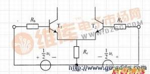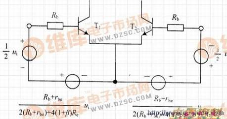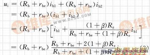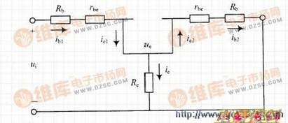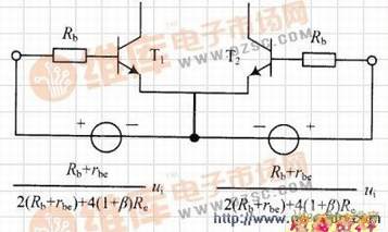图1所示电路,输人信号线经ui经T1的发射极耦合传输到T2的发射极,输人回路的微变等效电路如图2所示。其中: rbc为 的输人;β为晶体管的放大系数。