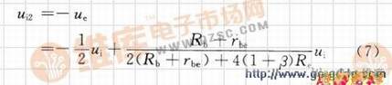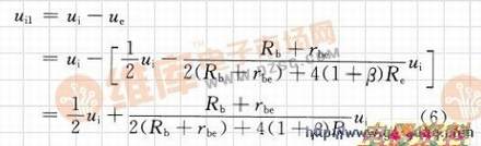 在保持所产生的共模输人咆流不变的条件下,可将图5中每边的共模输入信号等效变换后作用于输入端和地之问、共模输人信号等效变换成数值为ui/2,发射极经电阻Re接地,如图7所示。