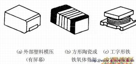 图5(a)所示是内部有骨架绕线,外部有磁性材料屏蔽经塑料模压封装的结构;图5(b)所示是用长方形骨架绕线而成(骨架有陶瓷骨架或铁氧体骨架)的结构,两端头供用;图5(c)为工字形陶瓷、铝或铁氧体骨架,焊接部分在骨架底部。