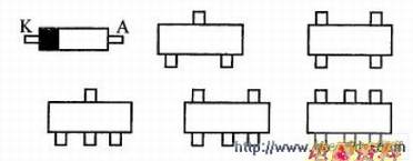 贴片二极管有多种封装形式,主要可分成三种:二引线型、圆柱型(玻封或塑封)和小型塑封型。二引线型的顶面及圆柱型的圆周上有一横条标志线,表示二极管的负极端。常见贴片二极管的外形如图6 所示。