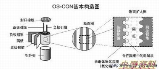 有机半导体铝电解电容的结构与液态铝电解电容相似,多采用直插立式封装方式(图2)。不同之处在于固态铝聚合物电解电容的阴极材料用固态的有机半导体浸膏替代电解液,在提高各项电气性能的同时有效解决了电解液蒸发、泄漏、易燃等难题。