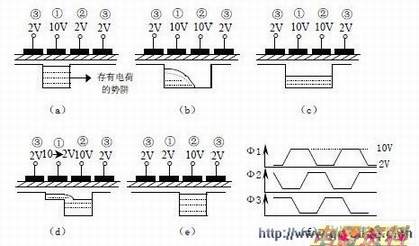 对于二相器件而言,若每个电极都有非对称结构,那么可以实现电荷的定向移动。以图2.3 为例加以说明。这里采用两个不同的氧化厚度来实现表面势的非对称性。在金属电极上加同样的时,厚氧化层下面的表面势比薄氧化层下面的表面势低。因此在图2中所示的结构中每个电极的厚氧化层下面存在一个内建势垒,以防止存储在薄氧化层下面的电荷往反方向移动。对二相CCD,只要注意到由于存储电荷使表面势发生变化,并且其表面势必须始终低于势垒高度,那么我们很容易求出电荷存储容量。即: