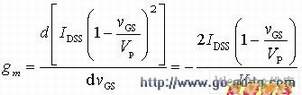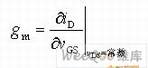 gm反映了栅-源电压对漏极电流的控制能力,是表征场效应管放大能力的一个重要参数。单位为西门子(s),有时也用ms或μs表示。需要指出的是,gm与管子的工作电流有关,iD越大,gm就越大。在放大 中,场效应管工作在饱和区(恒流区),gm可由式和